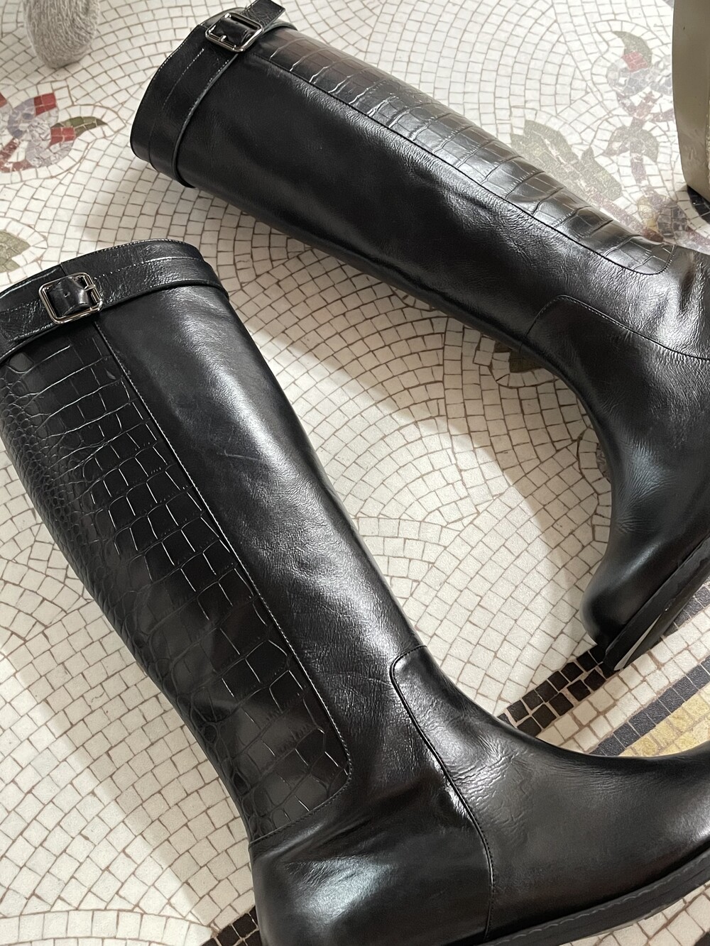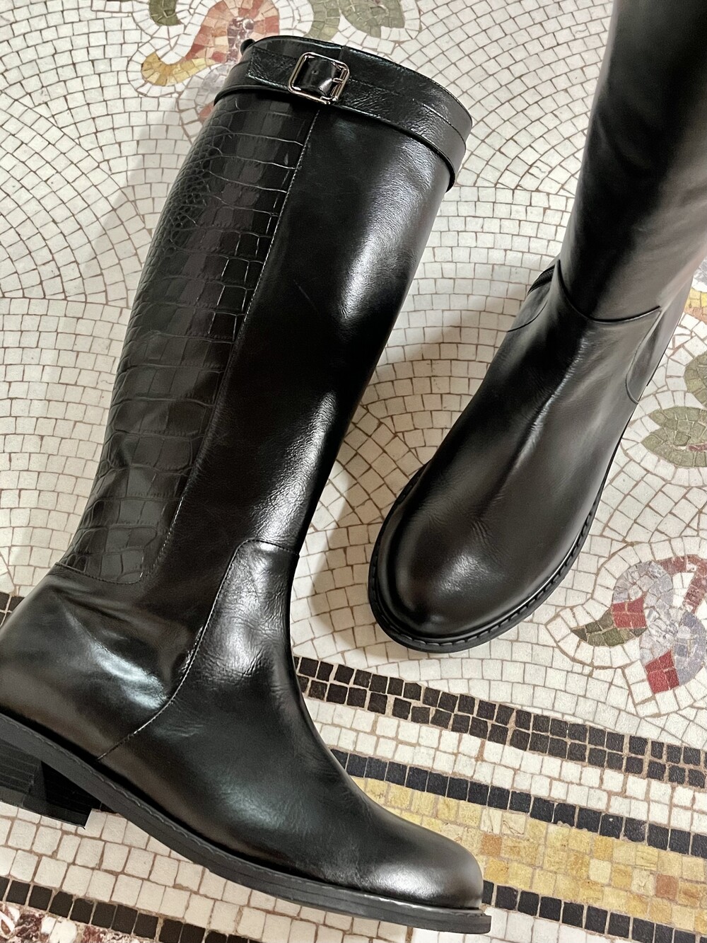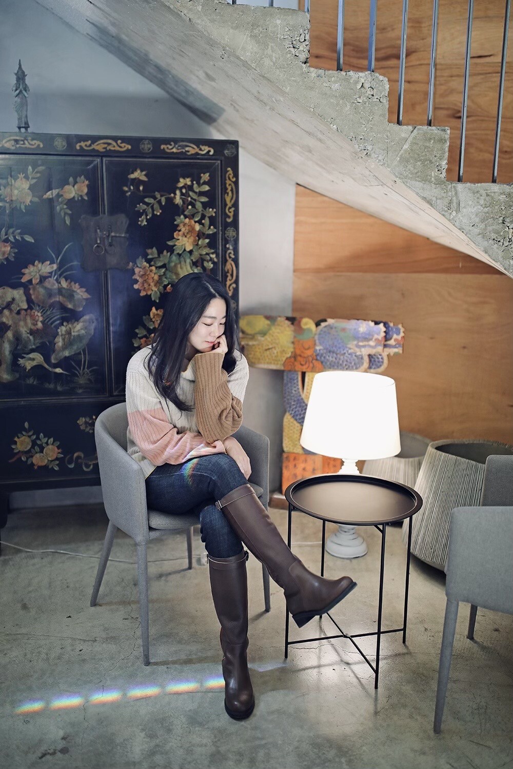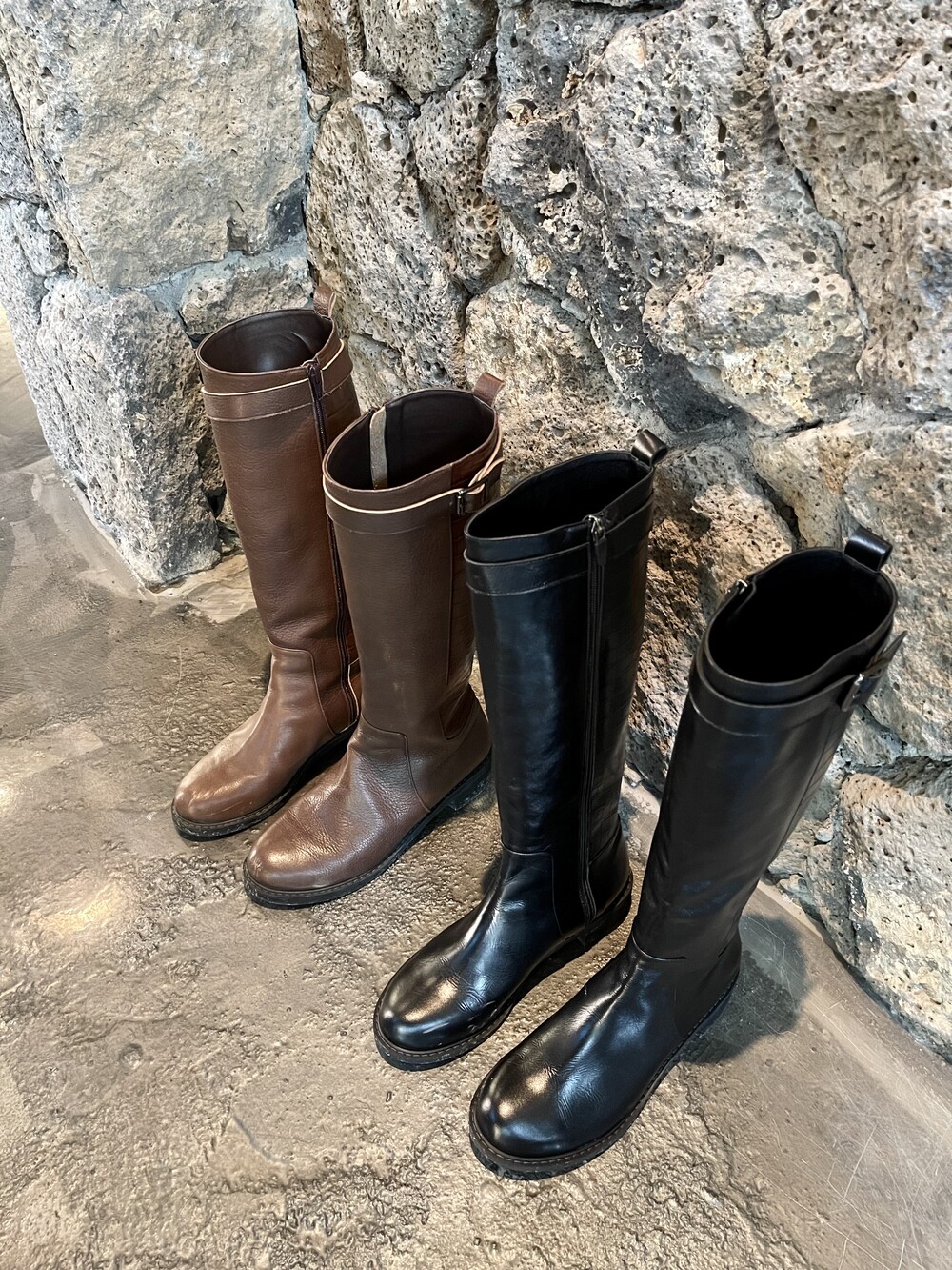 무릎까지 오는 롱한 바디감과 클래식한 스타일의 앞코가 둥근 실루엣의 롱부츠입니다.
