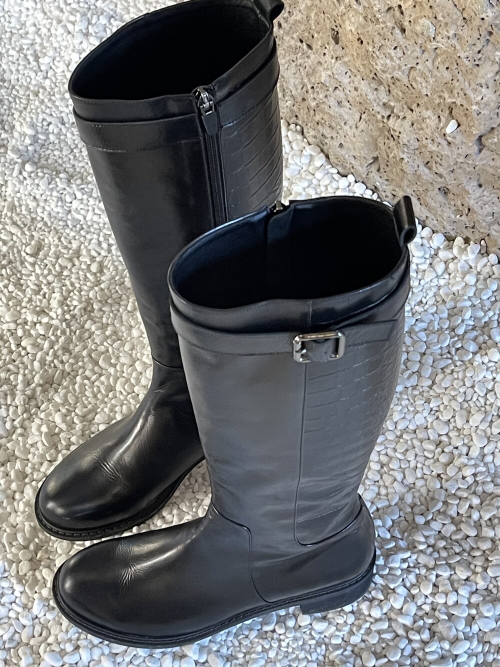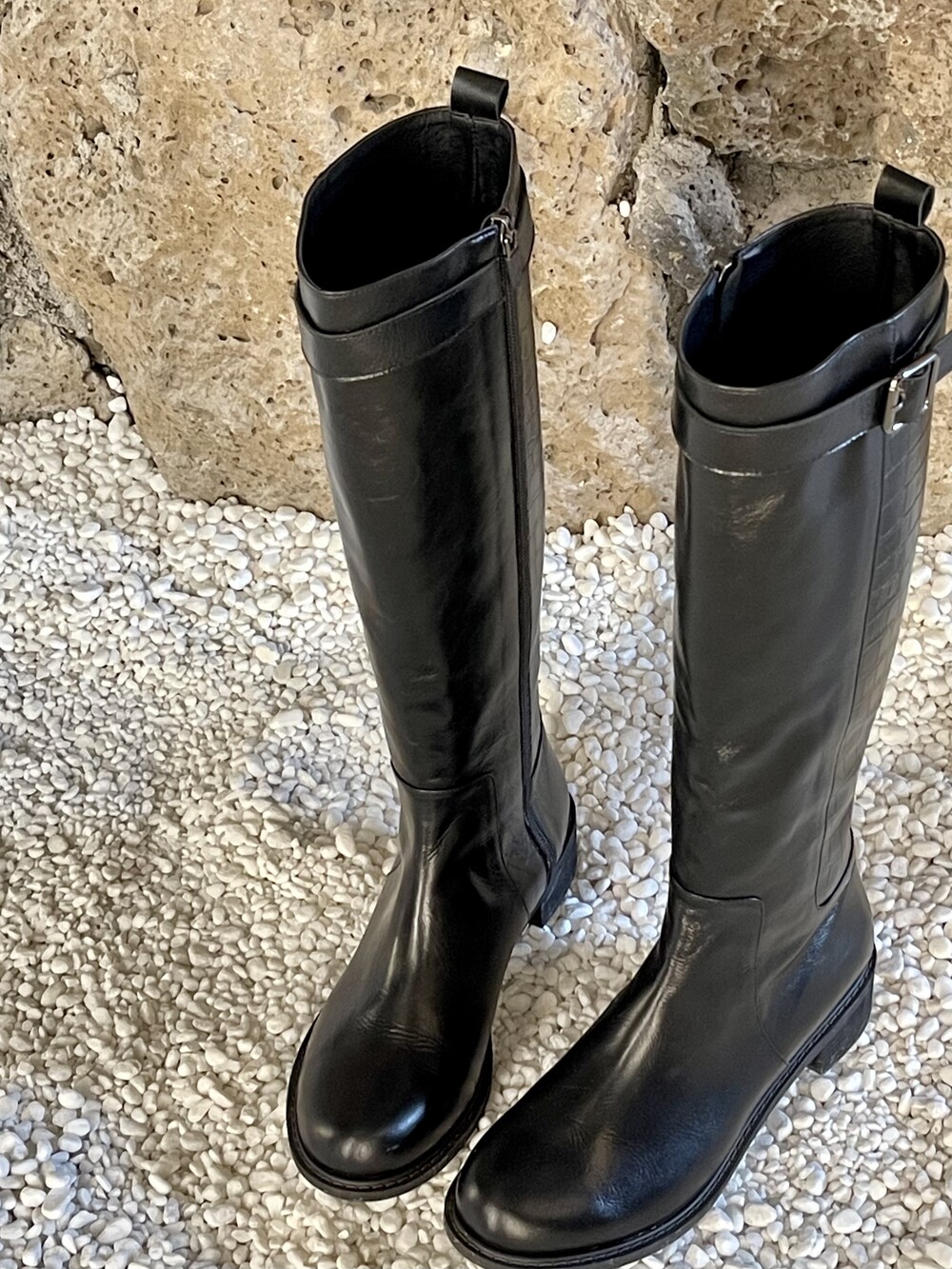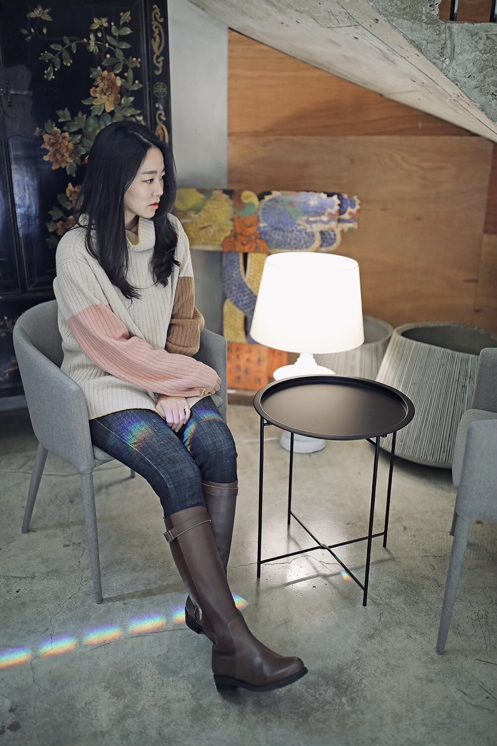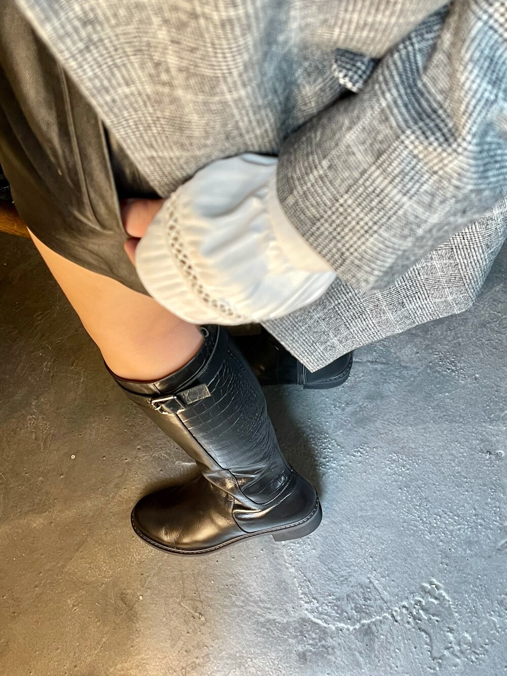 무릎까지 오는 롱한 바디감과 클래식한 스타일의 앞코가 둥근 실루엣의 롱부츠입니다.