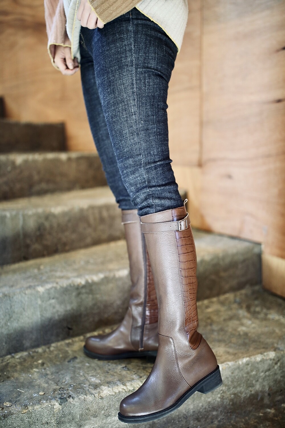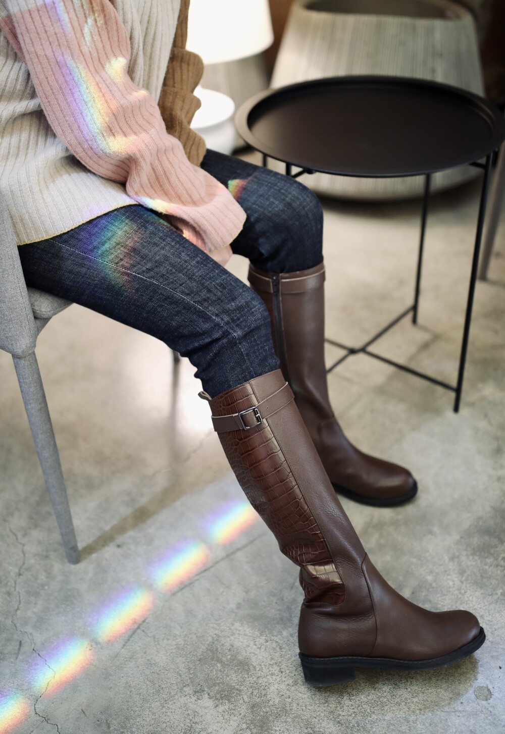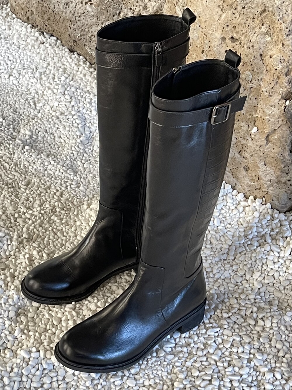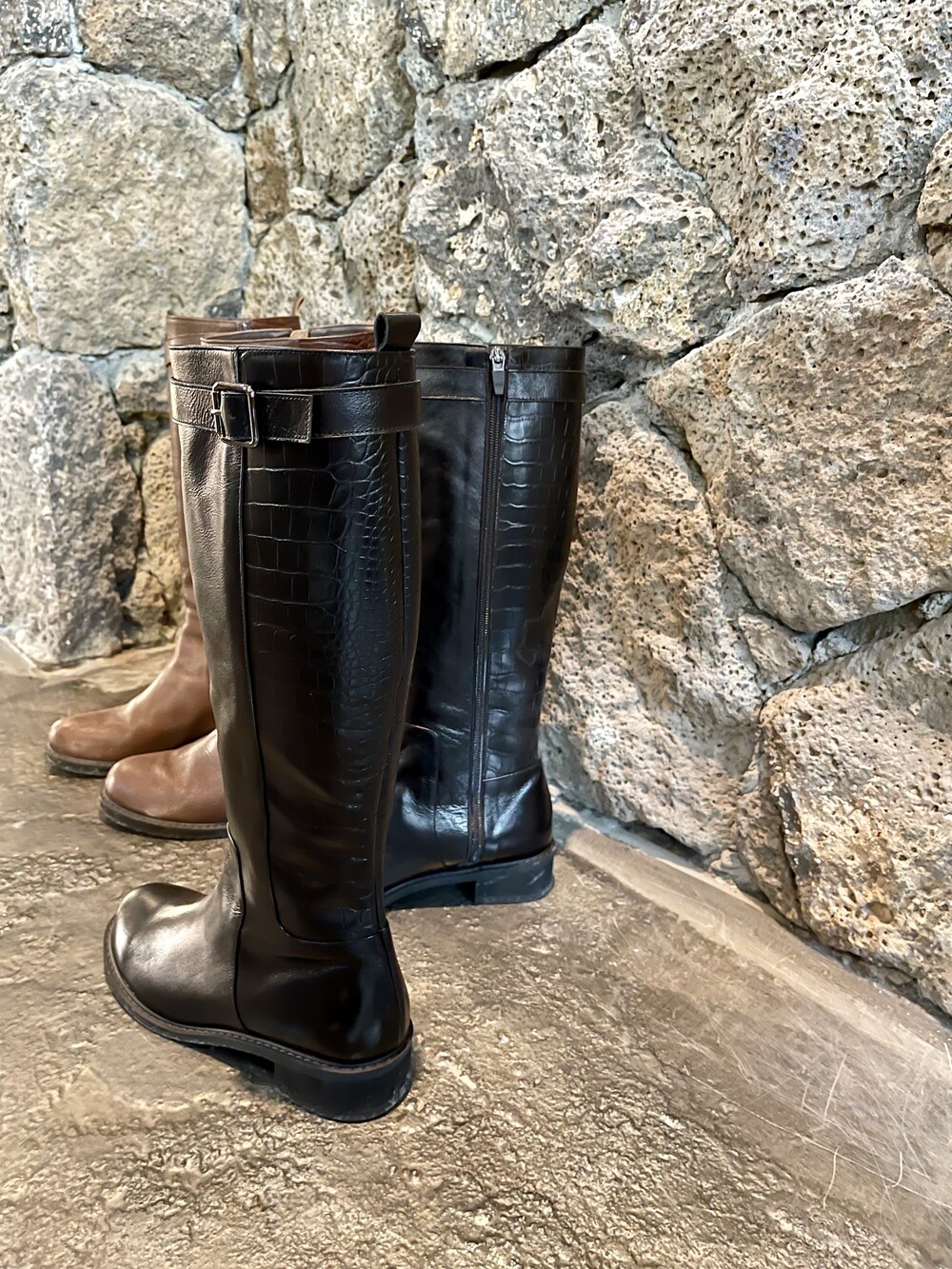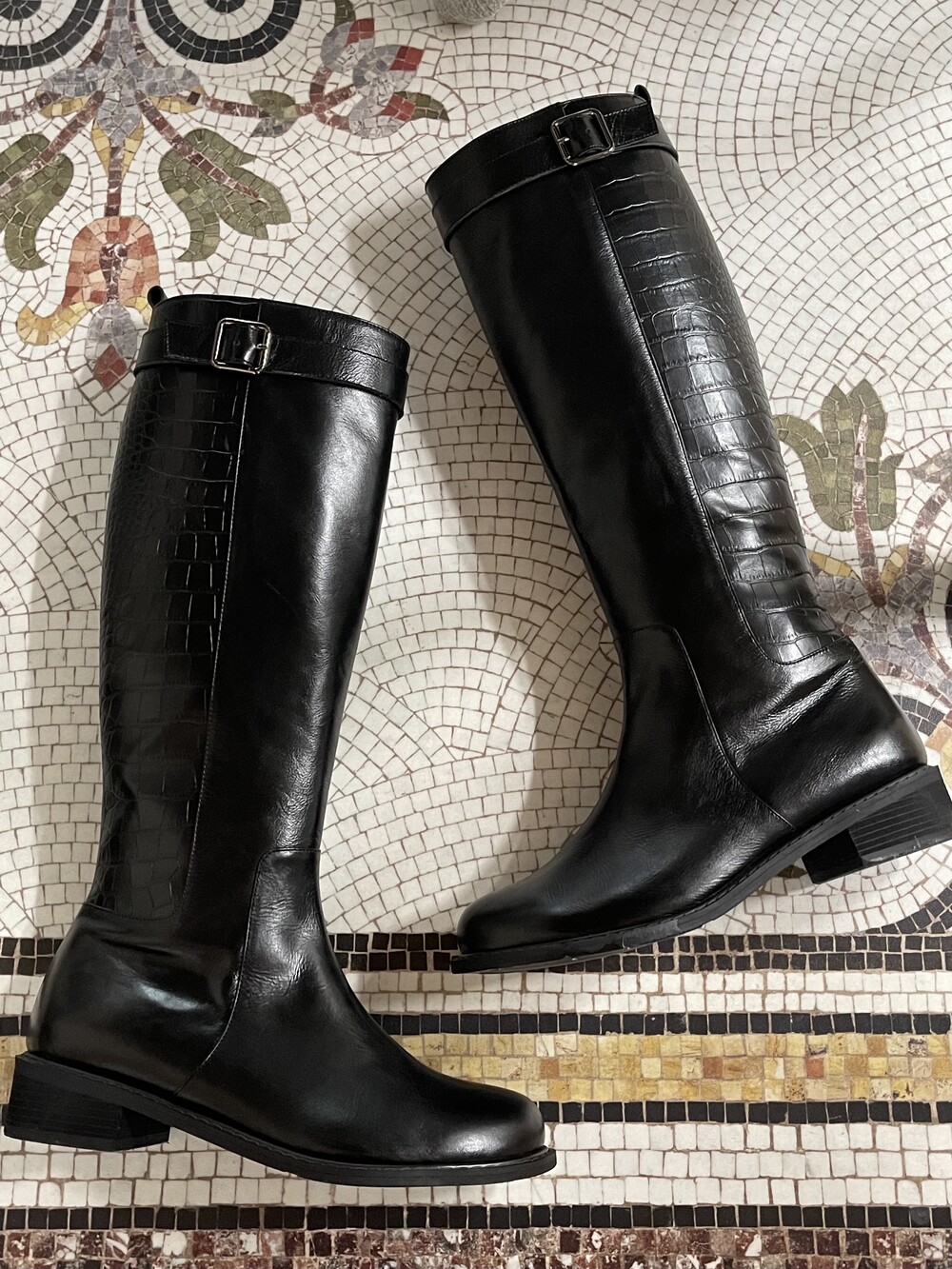 무릎까지 오는 롱한 바디감과 클래식한 스타일의 앞코가 둥근 실루엣의 롱부츠입니다.