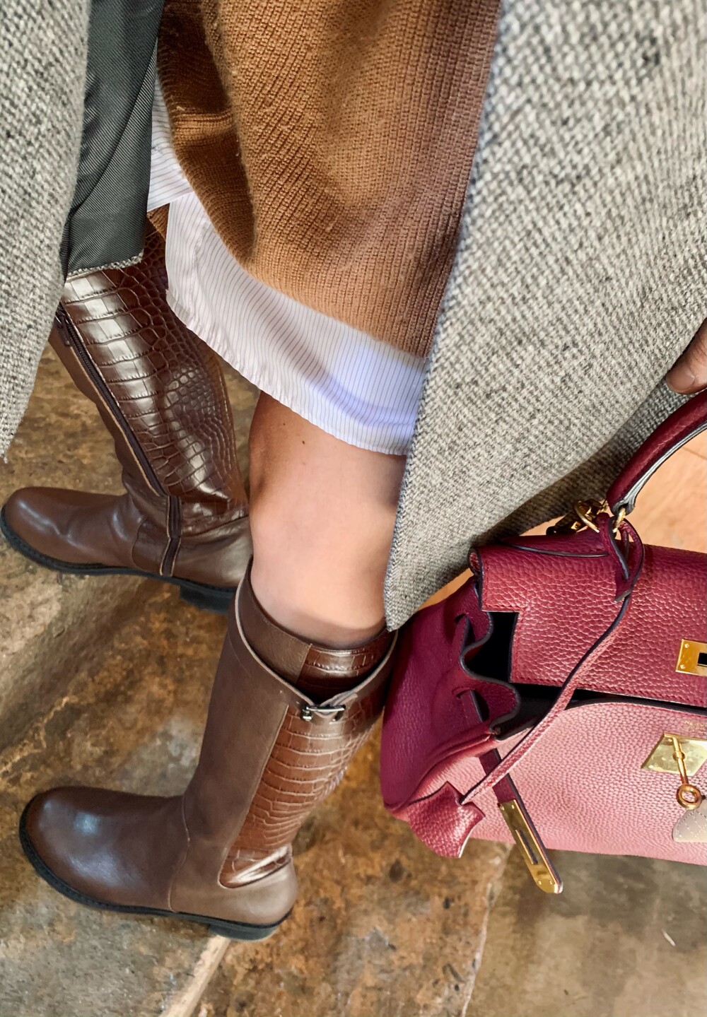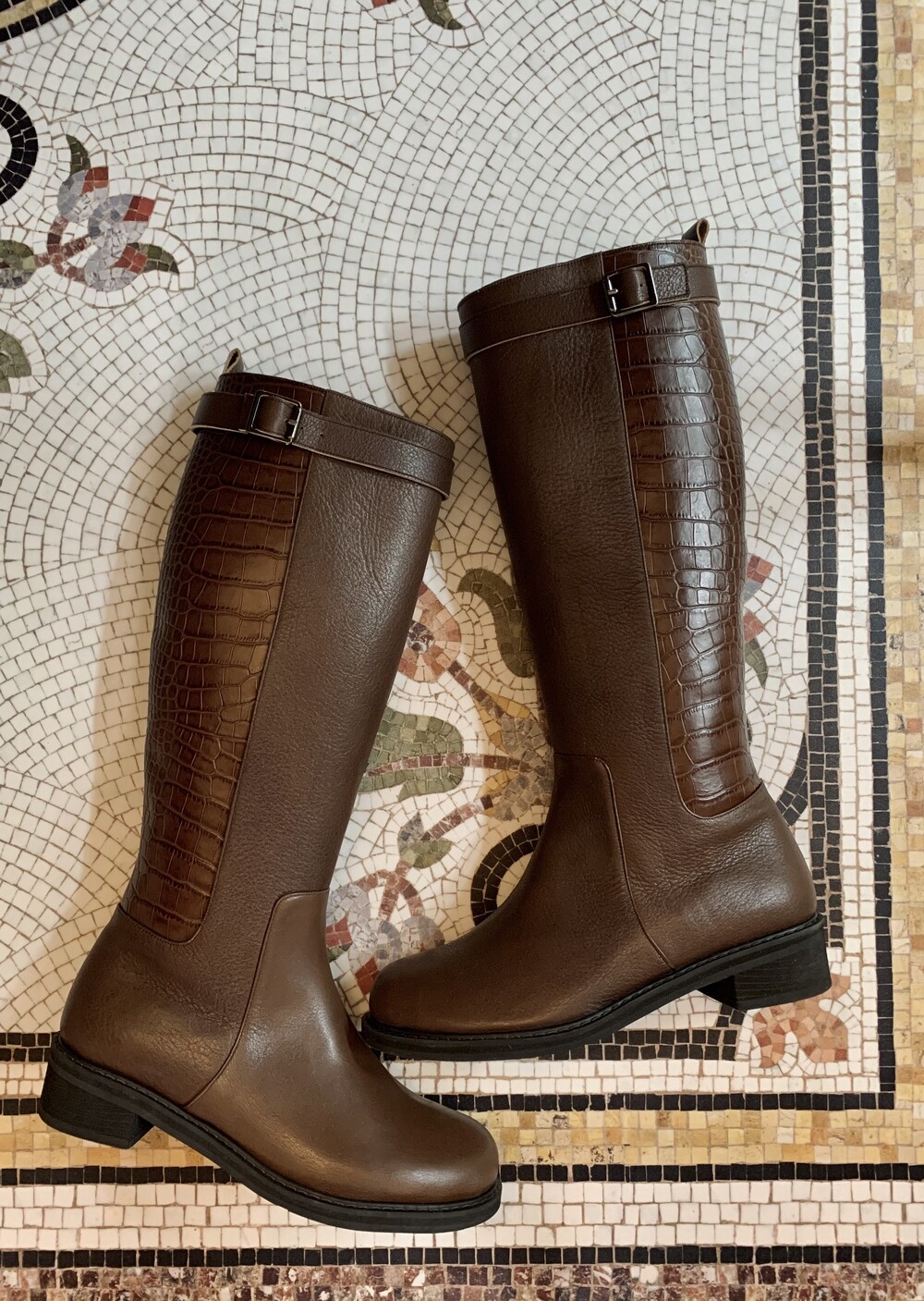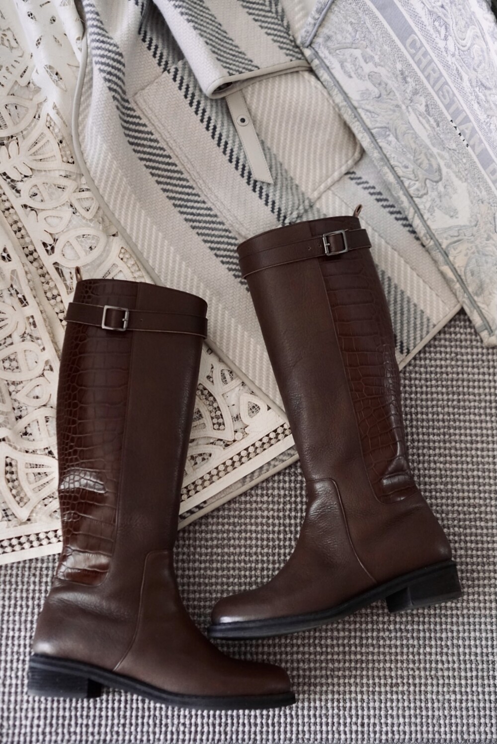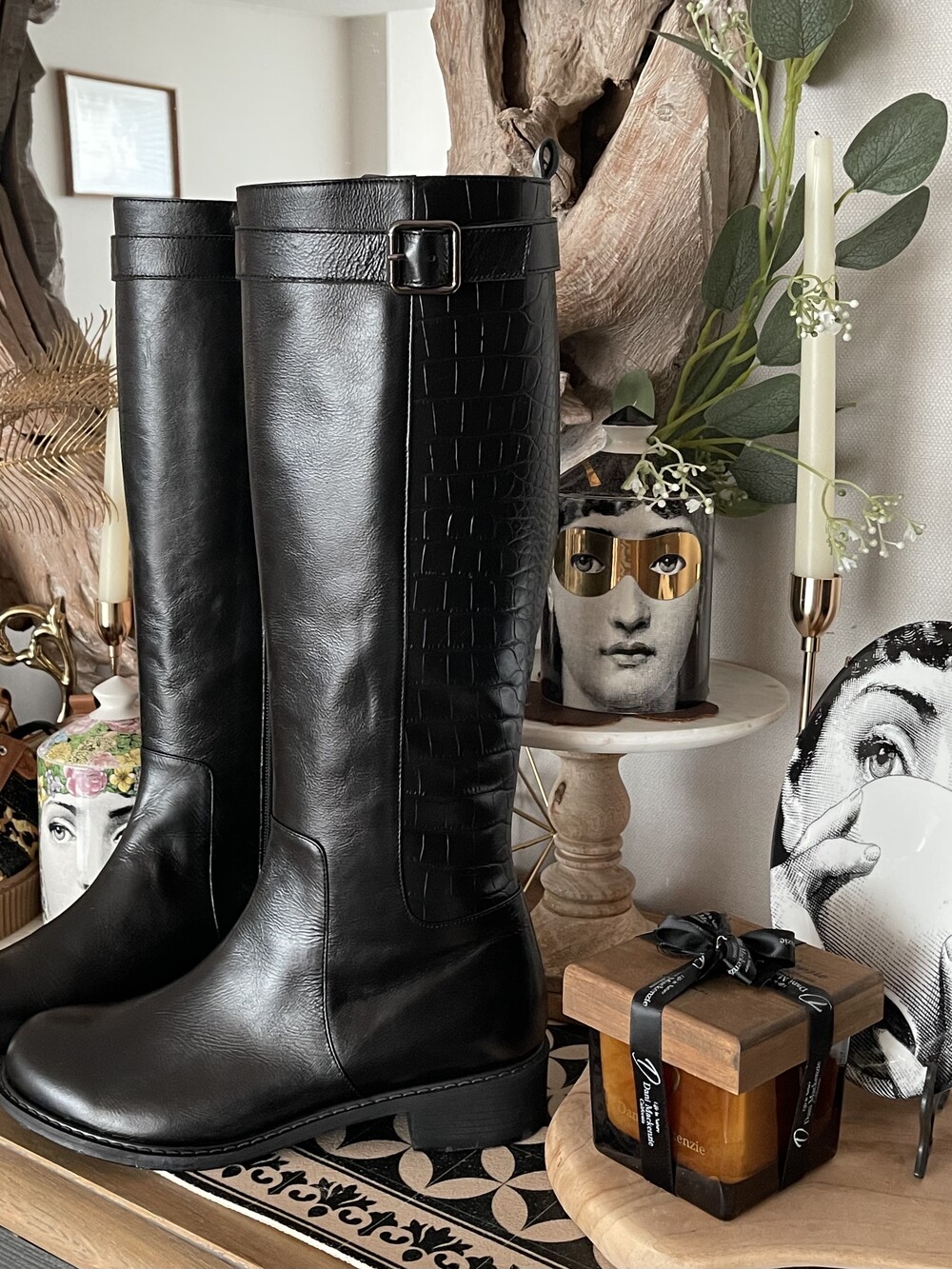 무릎까지 오는 롱한 바디감과 클래식한 스타일의 앞코가 둥근 실루엣의 롱부츠입니다.